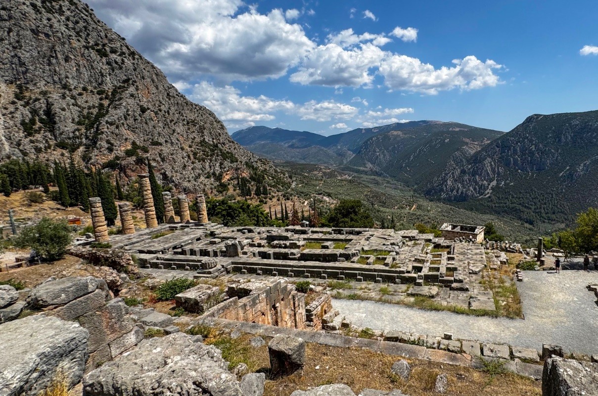 Datorită amplasării sale pe versantul muntelui, Delphi oferă priveliști magnifice asupra văii râului Pleistos și a livezilor de măslini care se întind până la mare. În trecut, această panoramă impresionantă făcea probabil parte din experiența spirituală a vizitatorilor sanctuarului.