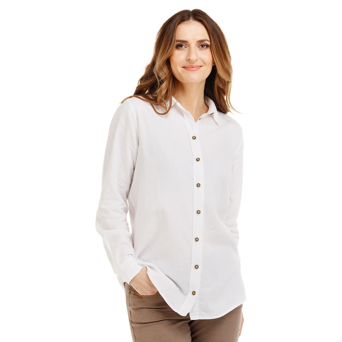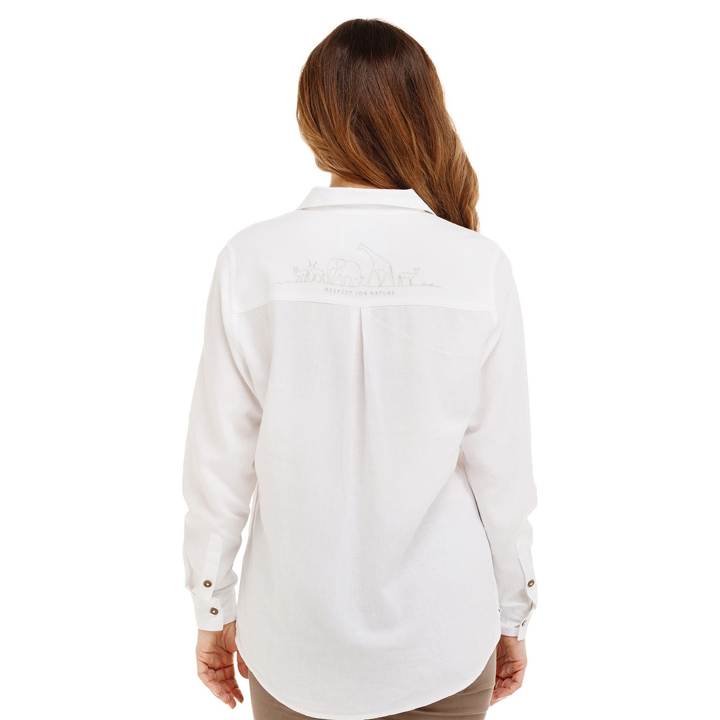 Cămașa FATIMA este realizată dintr-un amestec de in și viscoză (ECO VERO™), care combină respirabilitatea naturală a inului cu finețea și fluiditatea viscozei. Materialul este ușor, aerisit și plăcut la atingere, ideal pentru zilele călduroase. Cămașa este complet descheiată, are tiv inferior modelat și mici despicături laterale pentru libertate de mișcare. Nasturii decorativi, broderia cu motiv animalier pe spatele superior și broderia discretă de brand pe partea inferioară stângă completează aspectul curat în stil Bushman.