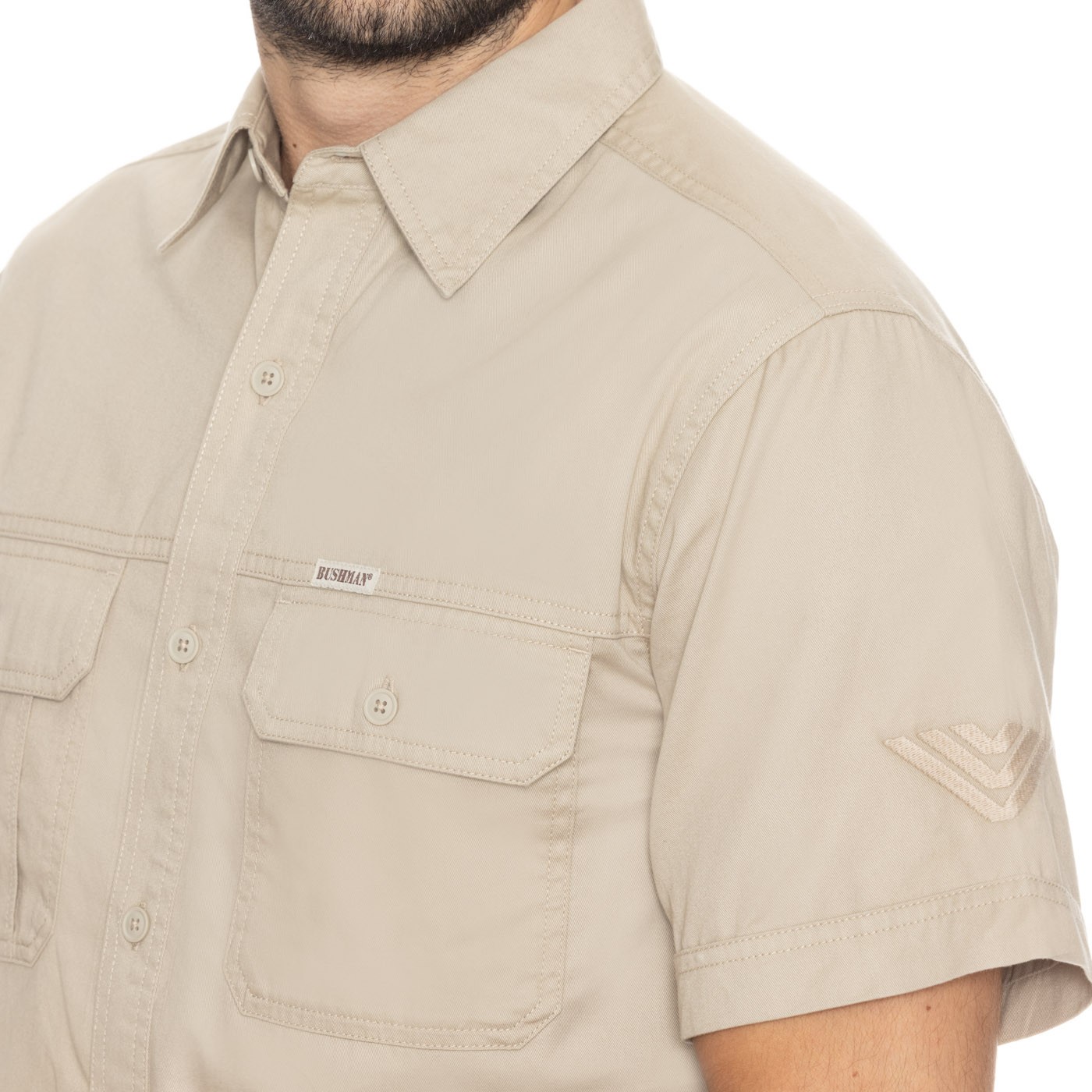 O cămașă expediție cu guler, Mâneci scurte, Închidere cu nasturi, Cusături despărțitoare, Buzunare frontale cu clape care se închid cu nasturi, Gaică la spate, Steag integrat in cusătura laterală, Etichetă Bushman pe clapeta buzunarului