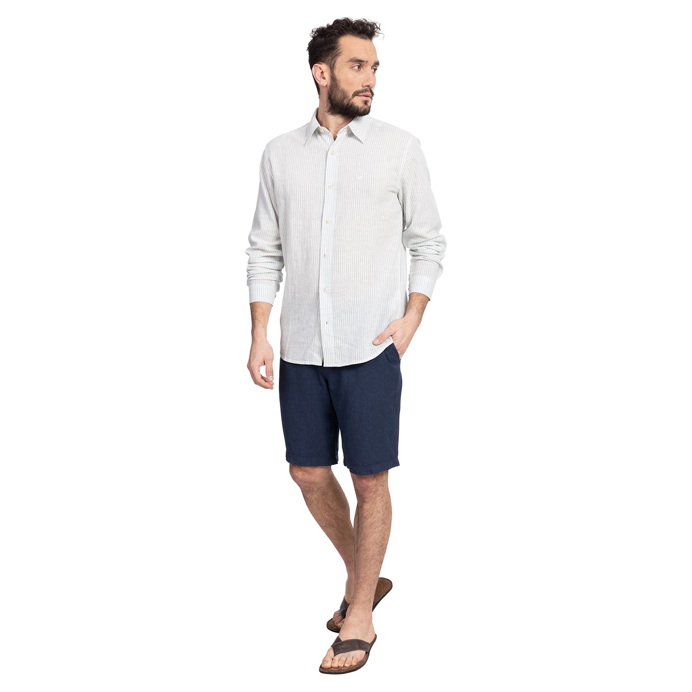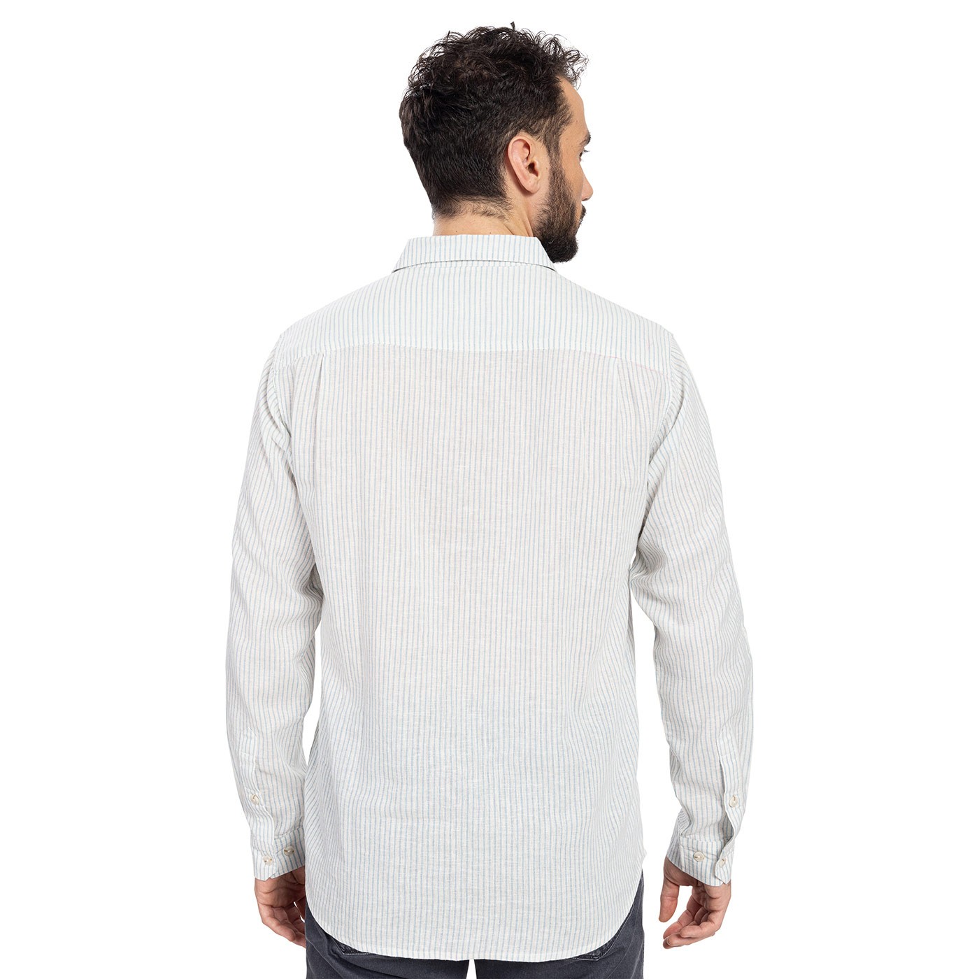 Cămașa bărbătească SALWIN cu mânecă lungă și dungi fine, cu croială perfectă, este confecționată din 55% in și 45% bumbac. Este vaporoasă și are proprietăți excelente de absorbție. Pe piept are o mică broderie cu inscripția Bushman "Vs". Greutate: 115 g/m2, dedurizată printr-o spălare specială.