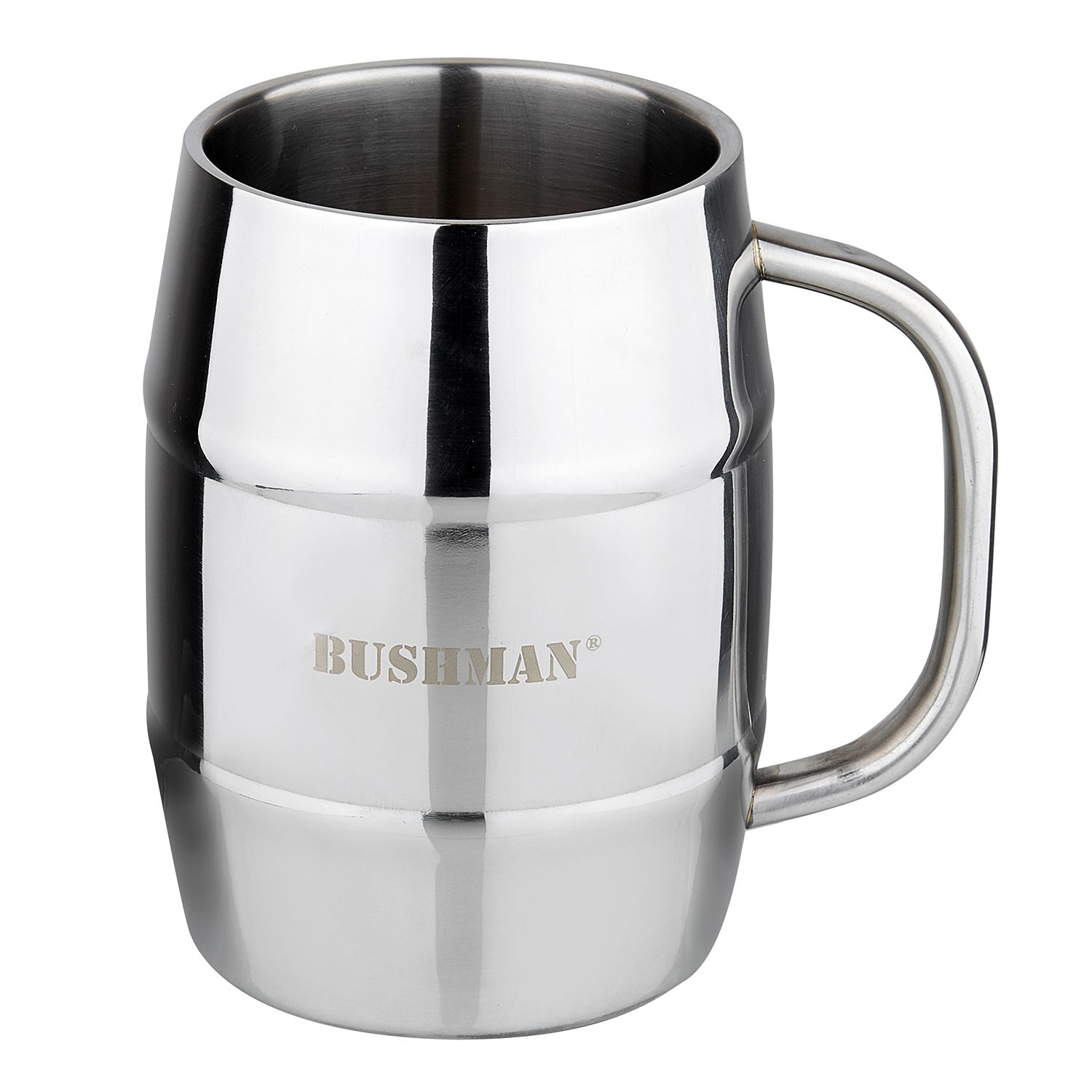 Designul deosebit este completat de un mâner practic pentru o portabilitate ușoară. Materialul ales (oțel inoxidabil cu pereți dubli) are ca rezultat o cană care nu poate fi spartă, si care este potrivită pentru expedițiile mari și mici. Fabricat dintr-un material sigur, nepericulos, cu o capacitate de 1000 ml. Nu există o senzație mai bună decât să ieși din cort dimineața și să-ti faci un ceai fierbinte într-o cană Bushman.