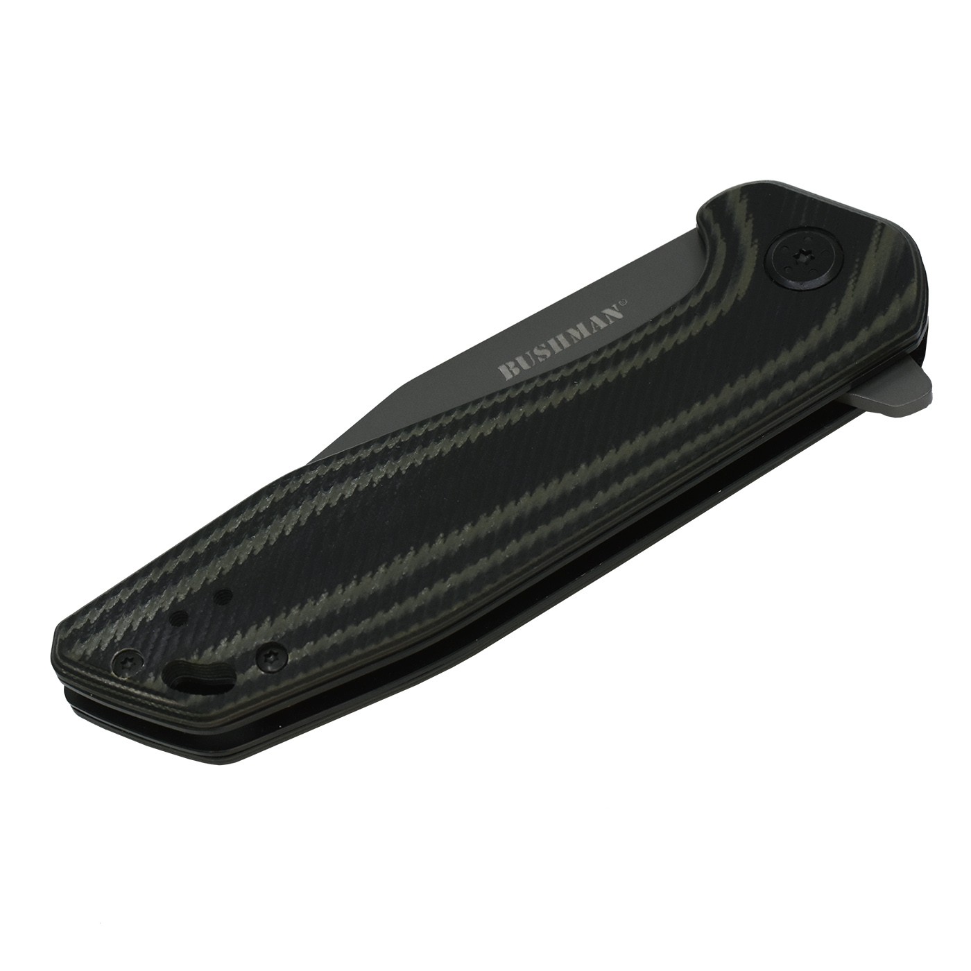 Mânerul G10 poate rezista la aproape orice. Această fibră de sticlă laminată cu rășină este utilizată și pentru paturile armelor și este cunoscută pentru durabilitatea sa extremă - poate rezista la impacturi, umezeală și uzură zilnică în buzunar sau rucsac. Datorită utilizării straturilor colorate, veți avea, de asemenea, o piesă cu adevărat originală în mână. Am gravat cu laser un logo subtil BUSHMAN pe lamă, iar o clemă practică vă asigură că veți avea întotdeauna la îndemână cuțitul VIMBA.