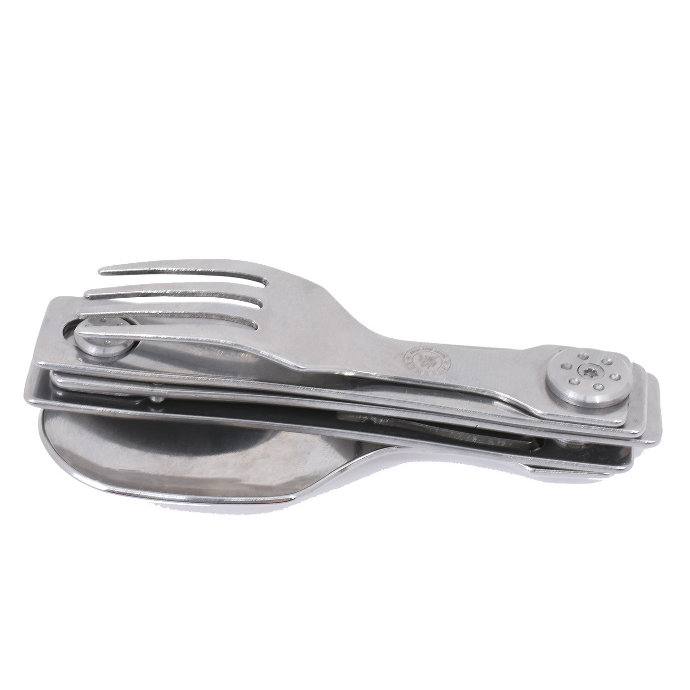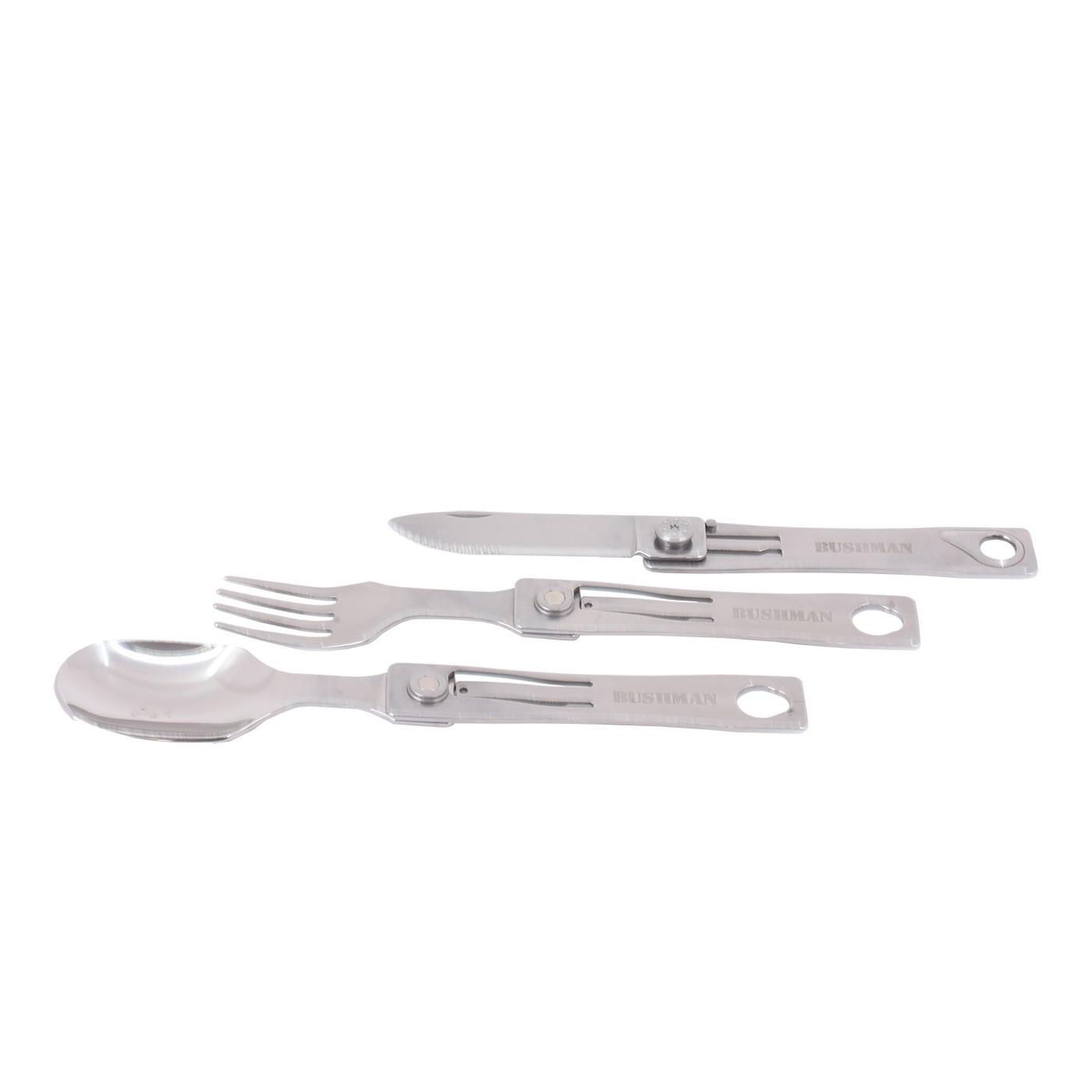 Să mănânci fără tacâmuri? Asta da provocare. O provocare cu care nu trebuie insa să te confrunți cand ai la dispozitie setul de tacâmuri CUTLERY II de la BUSHMAN. Acest set practic este util atunci când călătorești, campezi sau participi la un festival. Cele trei piese - cuțitul, furculița și lingura - sunt fabricate din oțel inoxidabil alimentar 304, care este rezistent la coroziune și foarte ușor de curățat. Furculița și lingura au propriul lor sistem de siguranță (cuțitul se pliază înainte și are un opritor) ... în timp ce mănânci și nu trebuie să-ți faci griji că se va plia in mod accidental.