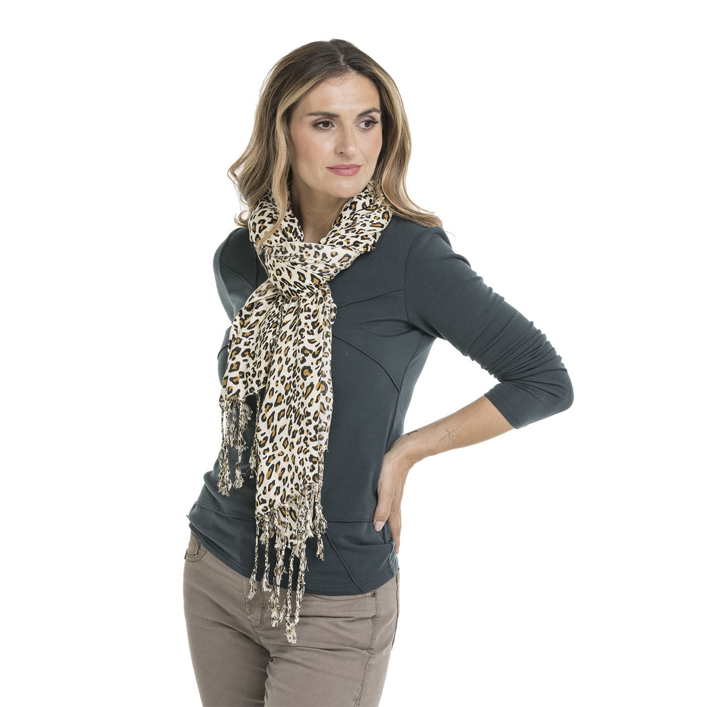 Îmbracă-te pentru sălbăticie! O eșarfă confortabilă, cu imprimeu animal print, îți va ține de cald, te va proteja de vânt și va adăuga o notă deosebită oricărei ținute. Franjurii de la capete adaugă o notă casual.