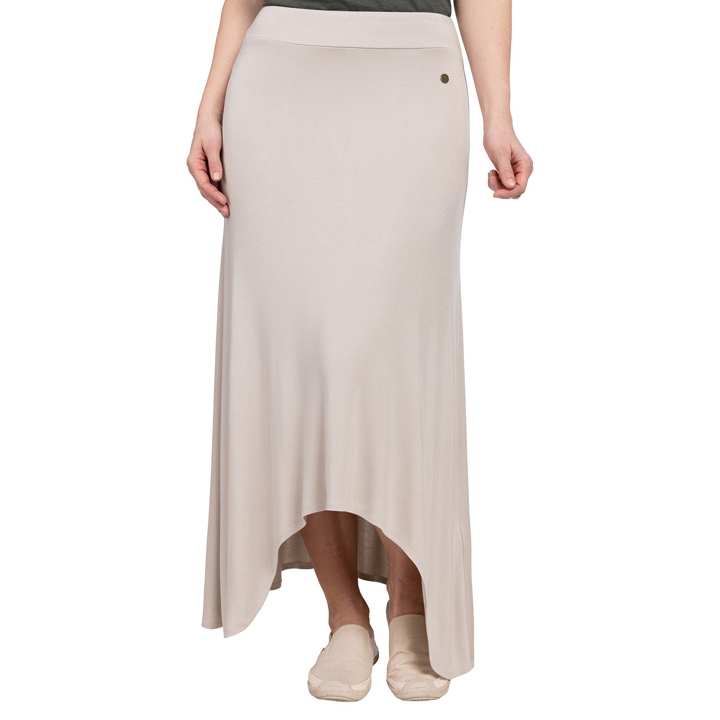 Confecționată din modal interlock (95%) și elastan (5%), fusta lungă BECCA se potrivește perfect și este, de asemenea, plăcută la atingere. Partea din față este decorată cu un mic logo metalic. Greutate: 220 g/m2, catifelată cu o spălare specială.