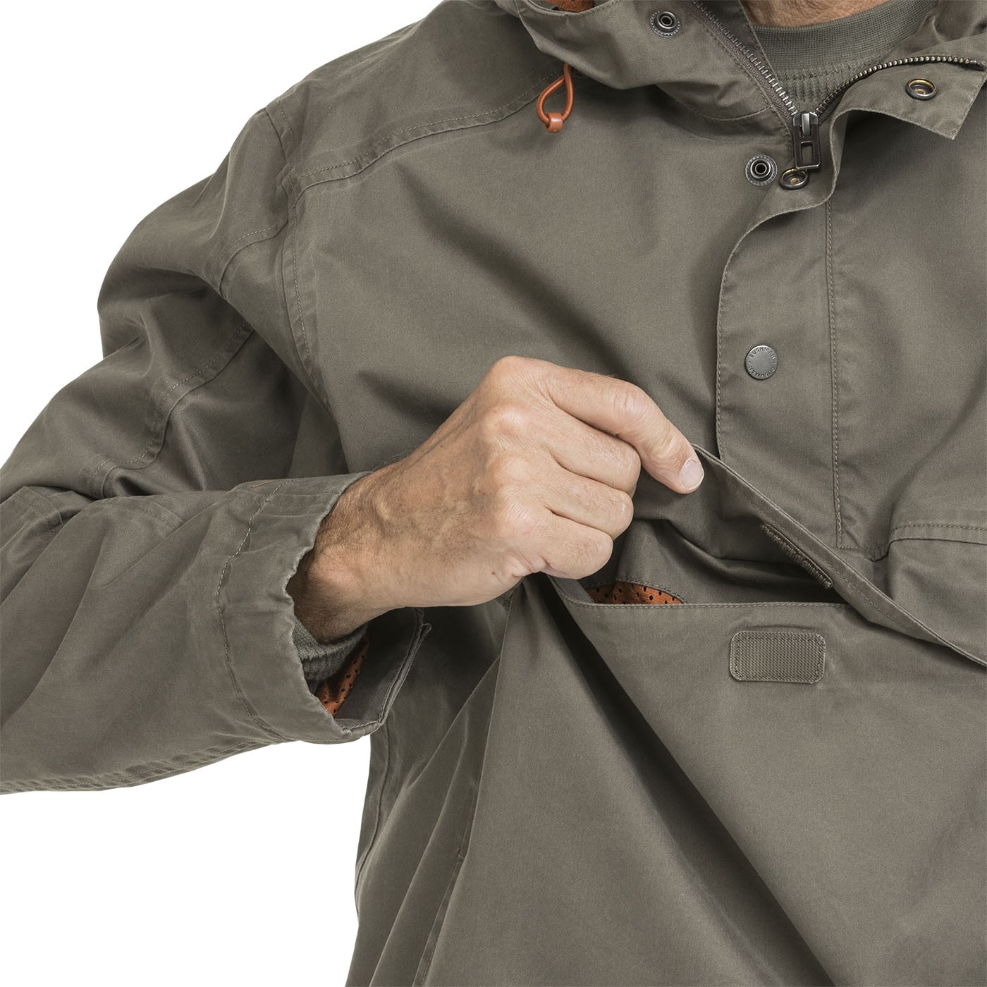 O jachetă rezistentă pentru toate tipurile de teren, în special pentru vreme rea! Este confecționată din țesătură twill rezistentă (70% bumbac, 30% poliester) cu membrană laminată și cusături lipite, ceea ce o face impermeabilă și respirabilă. Se îmbracă peste cap, se închide cu capse metalice și are o fantă practică pe partea stângă - pentru a fi mai ușor de îmbrăcat și pentru o mai bună aerisire. Gluga poate fi trasă în jos cu ajutorul unui șnur, iar gulerul este protejat de un fermoar și nasturi. Poți regla cu ușurință tivul și mânecile datorită manșetelor elastice și șnurului. Există, de asemenea, două buzunare spațioase în față și unul pe abdomen, fixate cu velcro. Un imprimeu portocaliu contrastant pe partea din față arată clar cu cine ține vremea. Specificații: Coloană de apă: 11.000 mm Respirabilitate: Ret 2,5 m²•Pa/W Greutate: 165 g/m²
