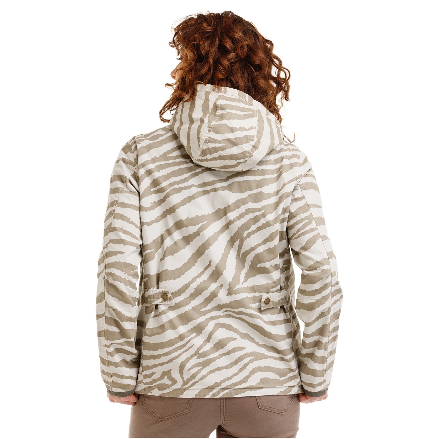 JATENGA este o jachetă reversibilă de damă (khaki / model zebrat), realizată din bumbac rezistent cu țesătură twill. Gluga detașabilă cu fermoar este completată de capse decorative de brand pe laterale. Talie reglabilă cu capse și pliurile din zona coatelor asigură libertate de mișcare. Buzunarele laterale pot fi închise cu capse ascunse, iar bucla de agățare este un detaliu practic. Fermoarul metalic YKK de calitate garantează durabilitatea.
