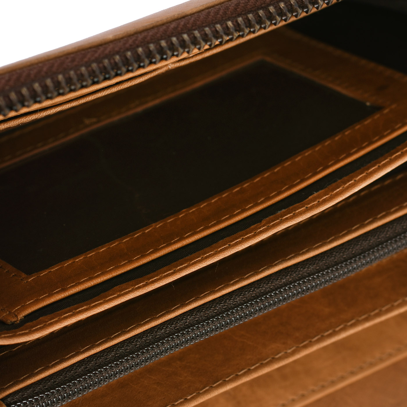 Se închide cu fermoar metalic de înaltă calitate, pe toată lungimea sa. Cu siguranță veți aprecia dotarea sa complexă, cu compartimente pentru cărți de credit, cărți de identitate și alte acte de identitate. În interior există și un buzunar pentru monede care poate fi închis cu fermoar. Sigla BUSHMAN în relief pe față.