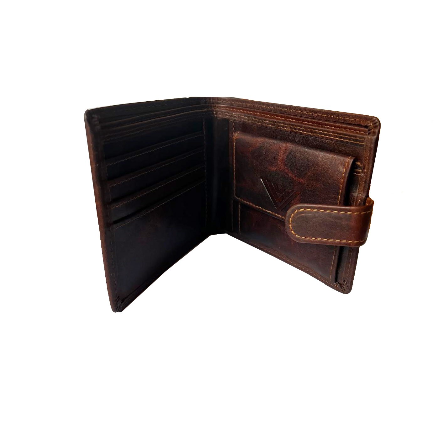 Portofelul clasic SCOTT cu închidere cu capsă (cu un mic element funcțional și de design utilizat pentru a închide portofelul mai sigur) este confecționat din piele de vacă cu o patină care se deschide la îndoire. Oferă 4 sloturi pentru carduri, 2 sloturi pentru acte de identitate, 2 compartimente pentru bancnote și un buzunar pentru monede. Dimensiuni: 12,5 × 9,5 × 2 cm. Logo BUSHMAN în relief.