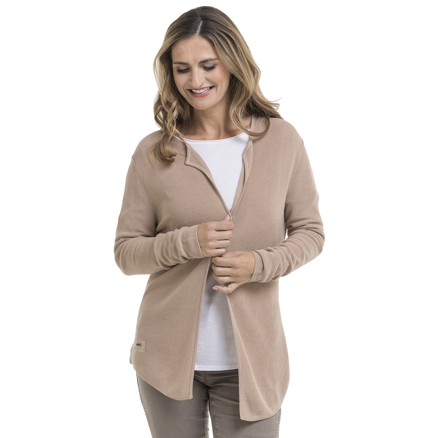 Această piesă combină confortul materialelor selectate cu eleganța sa discretă. Acest pulover cu croi de jachetă mai scurtă este tricotat dintr-un amestec luxos (TENCEL™ Lyocell 70%, bumbac 25% și mătase 5%), astfel încât are un luciu ușor, este moale la atingere și se potrivește perfect. Centura din talie accentuează silueta, iar partea frontală alungită adaugă o notă lejeră. Elegant, dar totuși fidel naturii – exact așa cum ne place.
