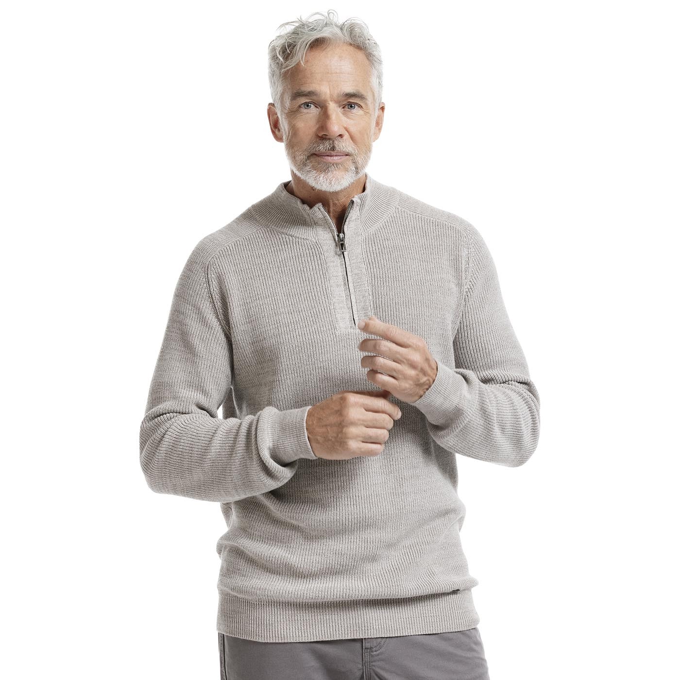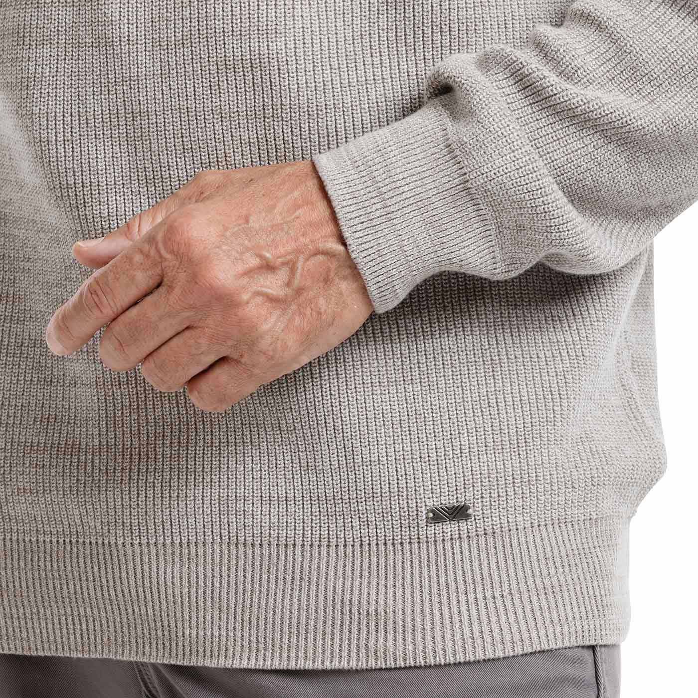 Acest pulover ușor transparent, din bumbac 100%, are o închidere cu fermoar, guler înalt și mâneci de tip „raglan” și este fabricat pe o mașină 7GG. Tricotul cu nervuri îi conferă un aspect șic, în timp ce micul logo BUSHMAN metalic din partea de jos îi adaugă un plus de rafinament. Puloverul a fost înmuiat cu un proces special de spălare. Greutate: 520 g/m2.