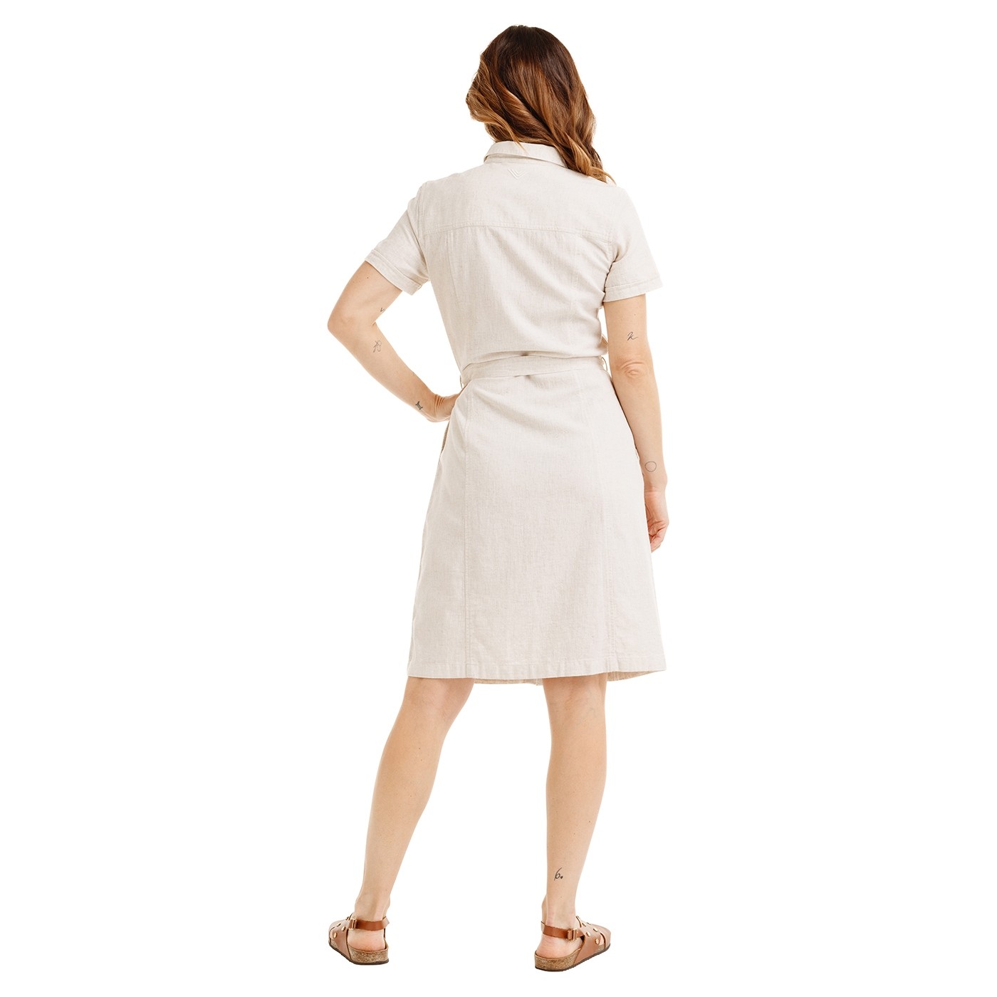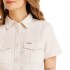 Rochie de damă cu închidere completă cu nasturi, potrivită și pentru expediții, realizată din amestec de bumbac și in. Croiala cambrată evidențiază silueta (susținută și de cureaua textilă), iar nasturii din bambus accentuează caracterul natural al modelului. Include buzunare aplicate pe piept și buzunare laterale în cusătură, la nivelul șoldurilor. Broderie discretă de brand pe spate și imprimeu de brand pe interiorul pieptului spatelui.