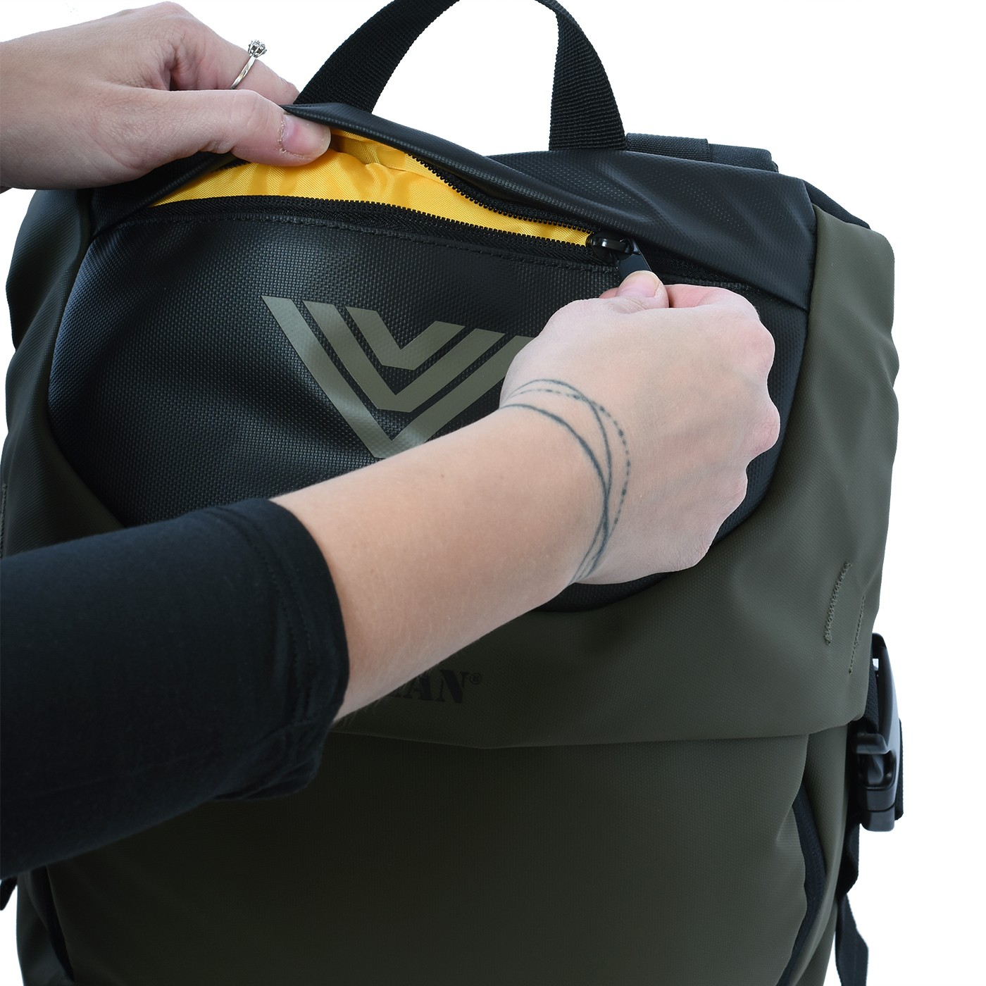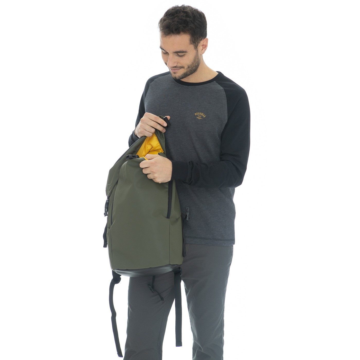 Capacul superior se închide cu catarame și protejează în mod fiabil buzunarul interior de pătrunderea apei. Nu numai că are logo-ul BUSHMAN și imprimeul "triplu V", un simbol al garanției calitatii, ci și un buzunar cu fermoar pentru obiecte mai mici. Spatele este întărit cu o curea practică - o puteți folosi pentru a atașa convenabil rucsacul.