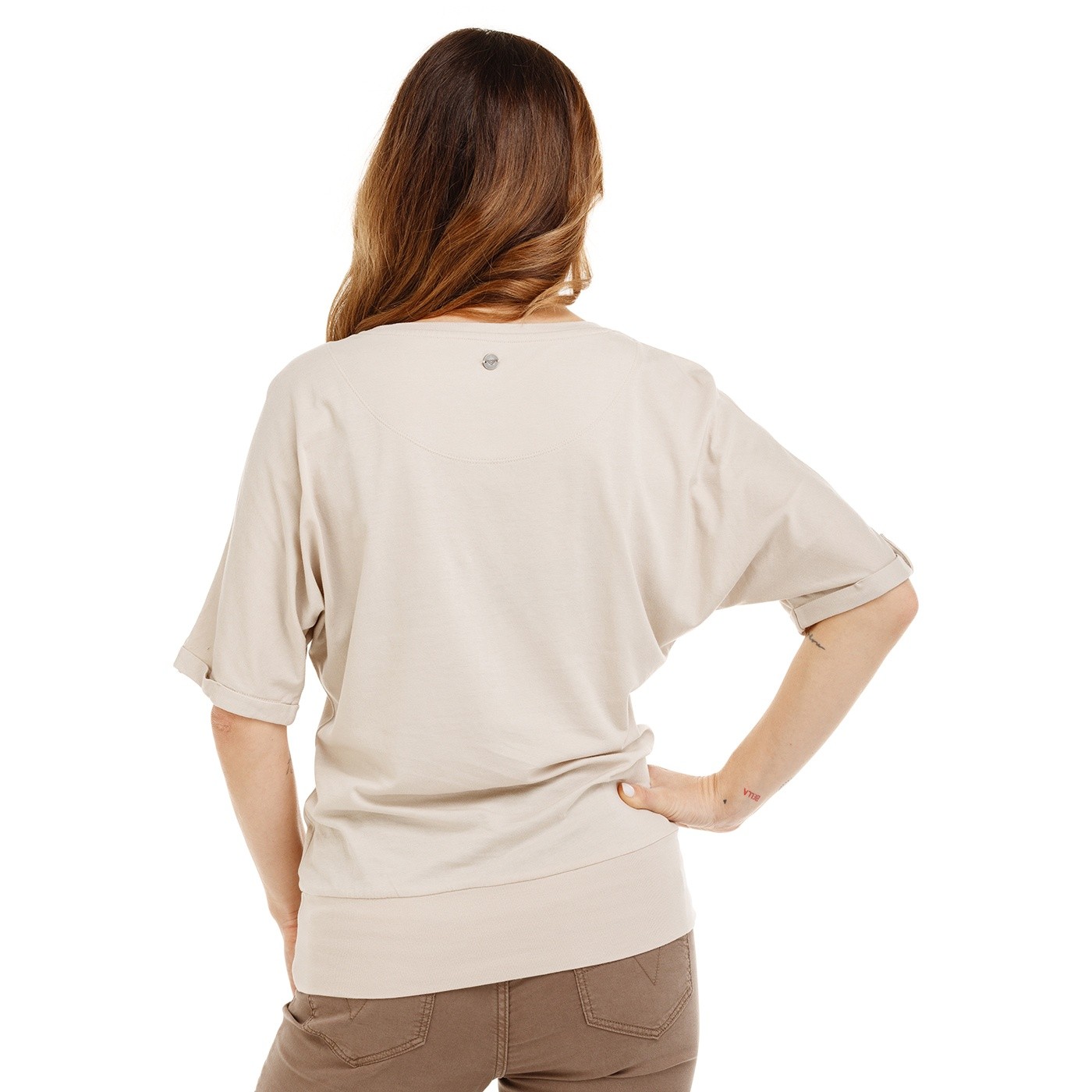 Tricou de damă din amestec bumbac și viscoză ECO VERO™, single jersey ușor, croială lejeră, mânecă căzută cu nasture metalic. Etichetă discretă metalică la spate. Varianta stone cu imprimeu pe piept.