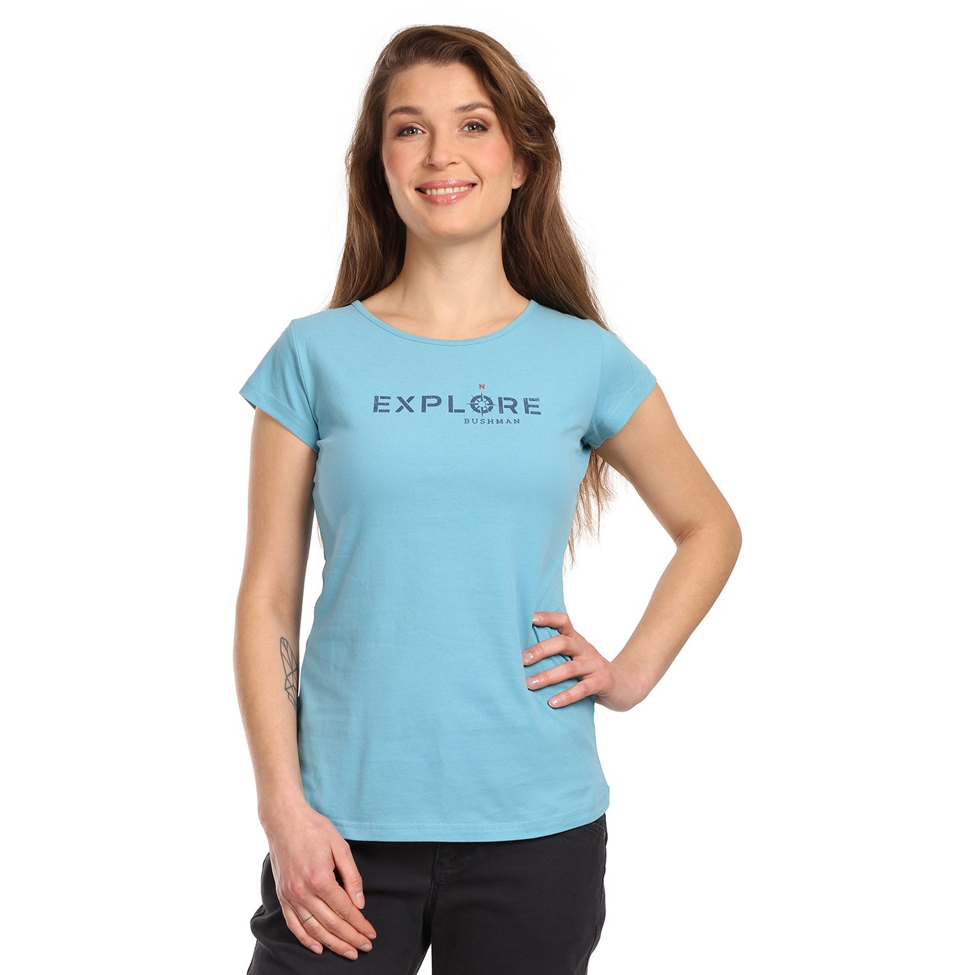 Acest tricou de damă este confecționat din tricot din bumbac cu croială clasică NATALIE III, pe o singură față, astfel încât oferă o senzație și mai catifelată. Are partea superioară a spatelui întărită și, de asemenea , urmează frumos linia siluetei feminine. Pe marginea de jos veți găsi un logo discret BUSHMAN.