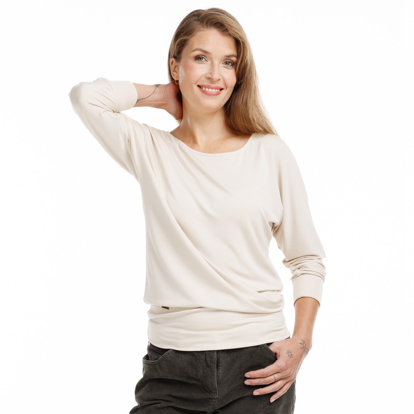 Acest tricou elegant cu mâneci lungi din modal, are o croială relaxată, mâneci kimono și un finisaj interesant cu aspect lucios în partea de jos. Acest tricou este frumos ventilat, ușor și dublu confortabil datorită spălării bio-light. 92% Lenzing modal, 8% elastan, greutate: 240 g/m2.