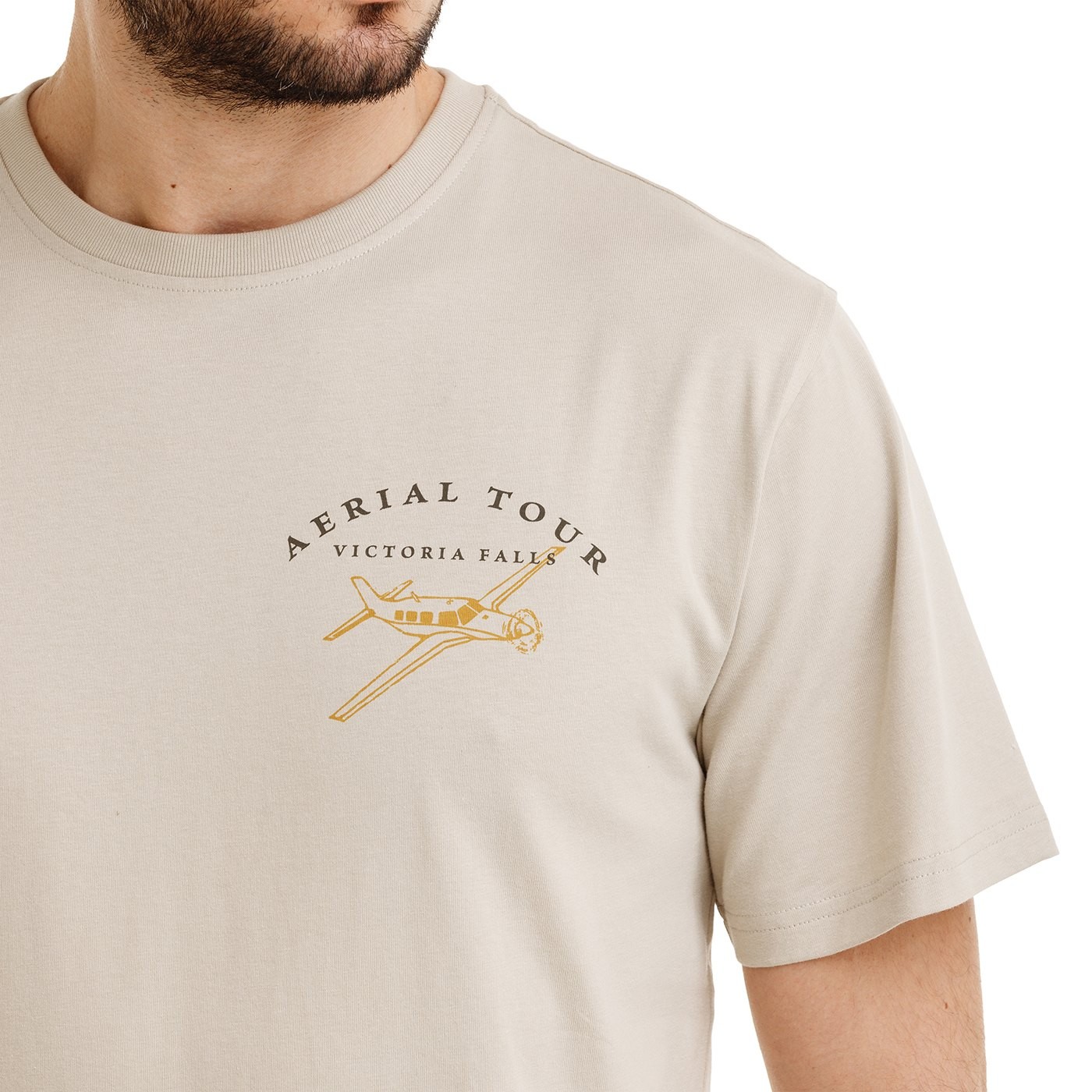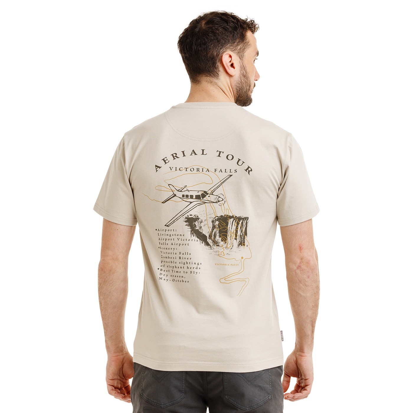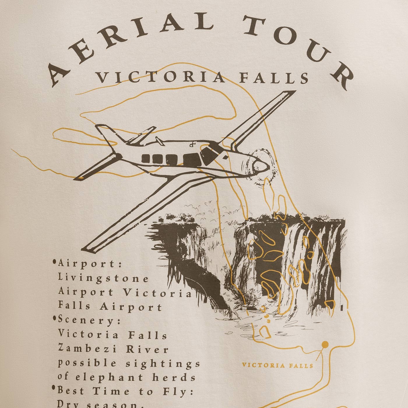 Pe piept vei găsi un mic imprimeu Aerial Tour Victoria Falls, iar pe spate un motiv expedițional de mari dimensiuni cu informații despre traseul către unul dintre cele mai spectaculoase fenomene naturale ale lumii. Tricoul amintește de o aventură în care vuietul apei, înălțimea și spațiul deschis joacă rolul principal.