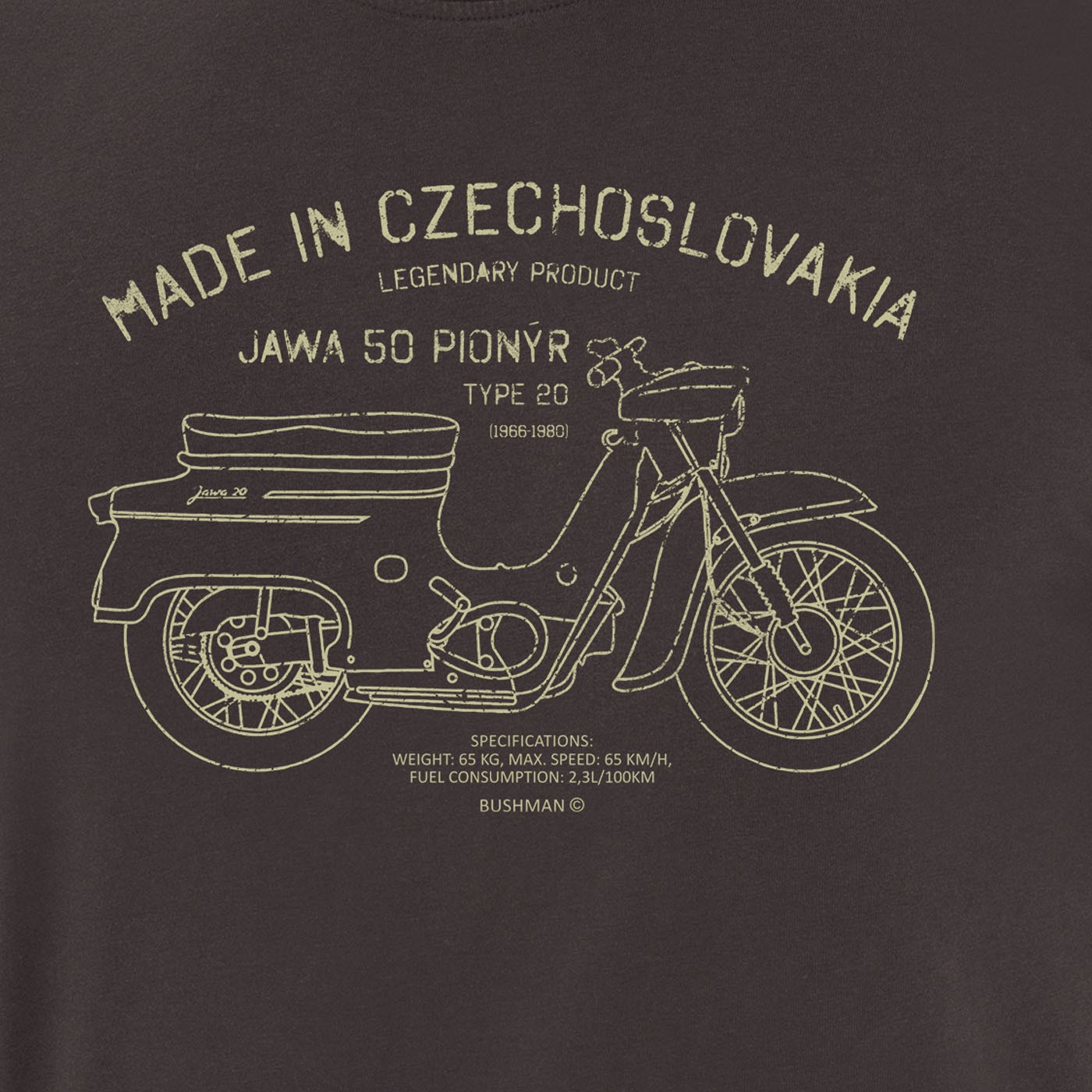 Apreciem lucrurile care au cucerit lumea sau inimile generațiilor trecute. De exemplu, „Fichtl” sau „Pincek”, tip 20 cu plăcuțe sau tip 21 Sport. Multe generații au crescut cu această motocicletă fabricată în Považské strojírny. Dezvoltată la mijlocul secolului al XX-lea ca mijloc de transport accesibil unui public cât mai larg, această motocicletă a fost și rămâne mașina ideală pentru învățarea principiilor unui motor în doi timpi și pentru antrenarea răbdării. Cu o ediție specială de imprimeuri pe această tema, applicate pe tricourile noastre cu mânecă scurtă din bumbac, BUSHMAN aduce un omagiu produselor legendare „fabricate în Cehoslovacia”. 100% bumbac, 180 g/m2, croială dreaptă.