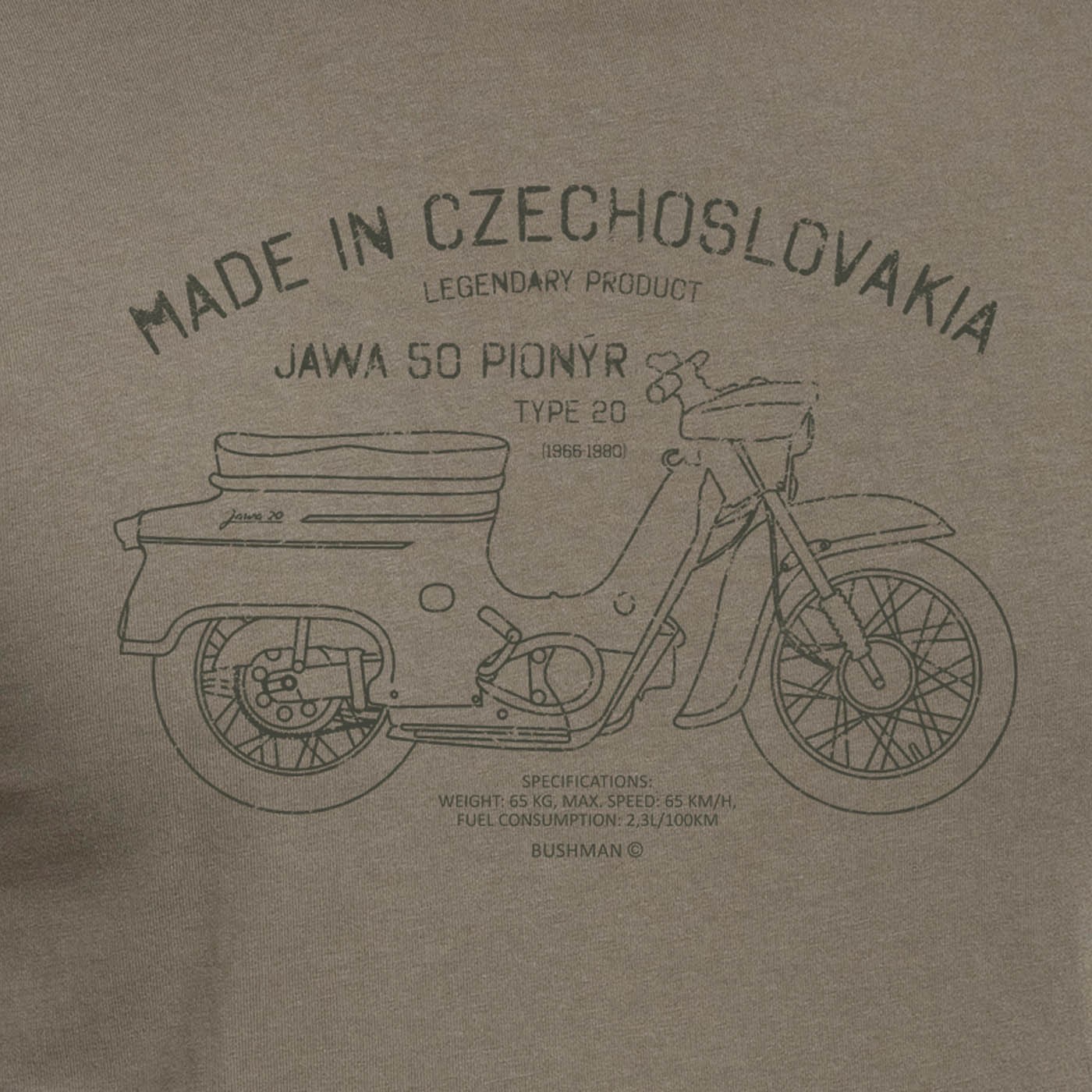 Apreciem lucrurile care au cucerit lumea sau inimile generațiilor trecute. De exemplu, „Fichtl” sau „Pincek”, tip 20 cu plăcuțe sau tip 21 Sport. Multe generații au crescut cu această motocicletă fabricată în Považské strojírny. Dezvoltată la mijlocul secolului al XX-lea ca mijloc de transport accesibil unui public cât mai larg, această motocicletă a fost și rămâne mașina ideală pentru învățarea principiilor unui motor în doi timpi și pentru antrenarea răbdării. Cu o ediție specială de imprimeuri pe această tema, applicate pe tricourile noastre cu mânecă scurtă din bumbac, BUSHMAN aduce un omagiu produselor legendare „fabricate în Cehoslovacia”. 100% bumbac, 180 g/m2, croială dreaptă.
