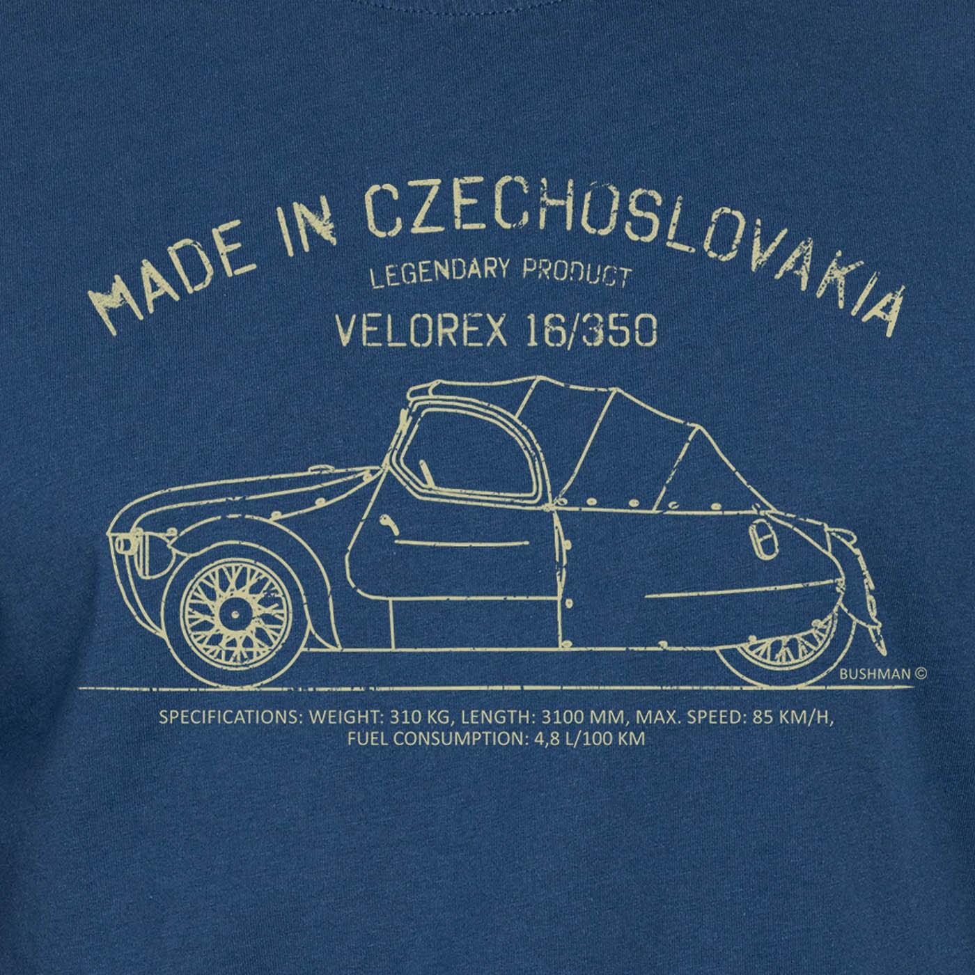 Apreciem lucrurile care au cucerit lumea sau inimile generațiilor trecute. Velorex, poreclit “cârpă”, avion de cârpă, picior de gâscă, Montgomery, liliac, țevi pe roti sau cort pe roti, a devenit singurul vehicul omologat cu caroserie din pânză din lume. Inițial un cadru tubular de serie mică, acoperit cu imitație de piele de designerii František și Mojmír Stránský, a fost fabricat la velodromul Solnice ca vehicul pentru persoanele cu dizabilități și a devenit faimos în filmul „Vrchní prchni”. Cu o ediție specială, având un imprimeu cu tema de mai sus amplasat pe tricourile noastre cu mânecă scurtă din bumbac, BUSHMAN aduce un omagiu produselor legendare „fabricat în Cehoslovacia”. 100% bumbac, 180 g/m2, croială dreaptă.
