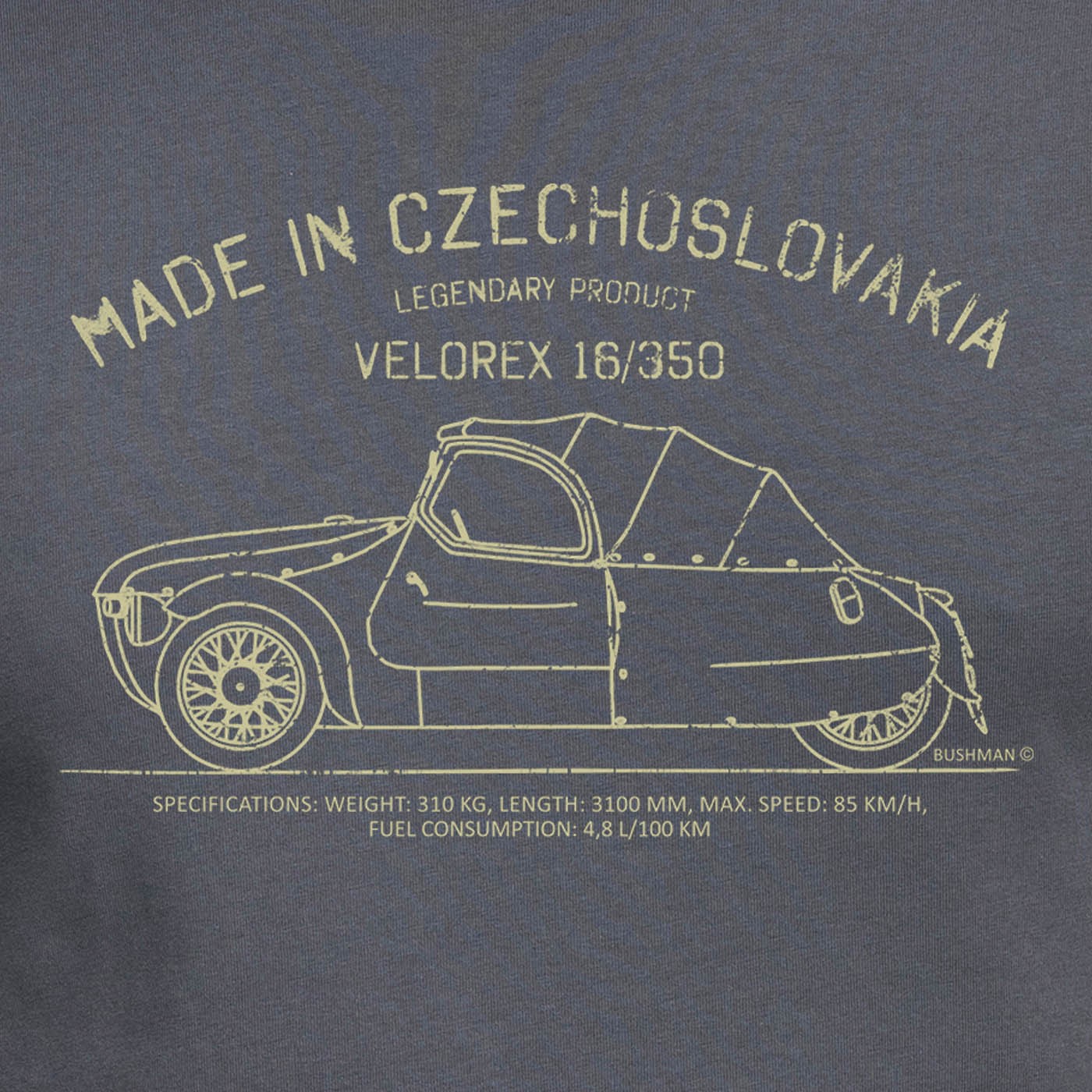 Apreciem lucrurile care au cucerit lumea sau inimile generațiilor trecute. Velorex, poreclit “cârpă”, avion de cârpă, picior de gâscă, Montgomery, liliac, țevi pe roti sau cort pe roti, a devenit singurul vehicul omologat cu caroserie din pânză din lume. Inițial un cadru tubular de serie mică, acoperit cu imitație de piele de designerii František și Mojmír Stránský, a fost fabricat la velodromul Solnice ca vehicul pentru persoanele cu dizabilități și a devenit faimos în filmul „Vrchní prchni”. Cu o ediție specială, având un imprimeu cu tema de mai sus amplasat pe tricourile noastre cu mânecă scurtă din bumbac, BUSHMAN aduce un omagiu produselor legendare „fabricat în Cehoslovacia”. 100% bumbac, 180 g/m2, croială dreaptă.
