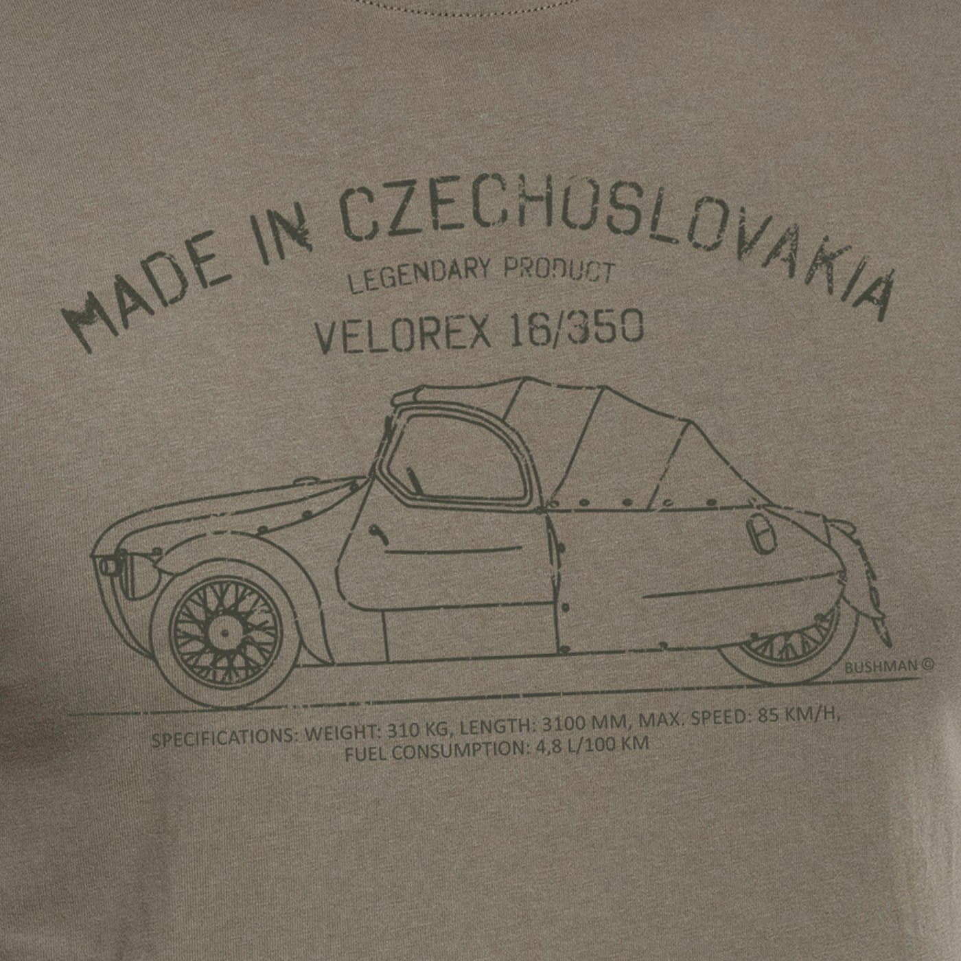 Apreciem lucrurile care au cucerit lumea sau inimile generațiilor trecute. Velorex, poreclit “cârpă”, avion de cârpă, picior de gâscă, Montgomery, liliac, țevi pe roti sau cort pe roti, a devenit singurul vehicul omologat cu caroserie din pânză din lume. Inițial un cadru tubular de serie mică, acoperit cu imitație de piele de designerii František și Mojmír Stránský, a fost fabricat la velodromul Solnice ca vehicul pentru persoanele cu dizabilități și a devenit faimos în filmul „Vrchní prchni”. Cu o ediție specială, având un imprimeu cu tema de mai sus amplasat pe tricourile noastre cu mânecă scurtă din bumbac, BUSHMAN aduce un omagiu produselor legendare „fabricat în Cehoslovacia”. 100% bumbac, 180 g/m2, croială dreaptă.