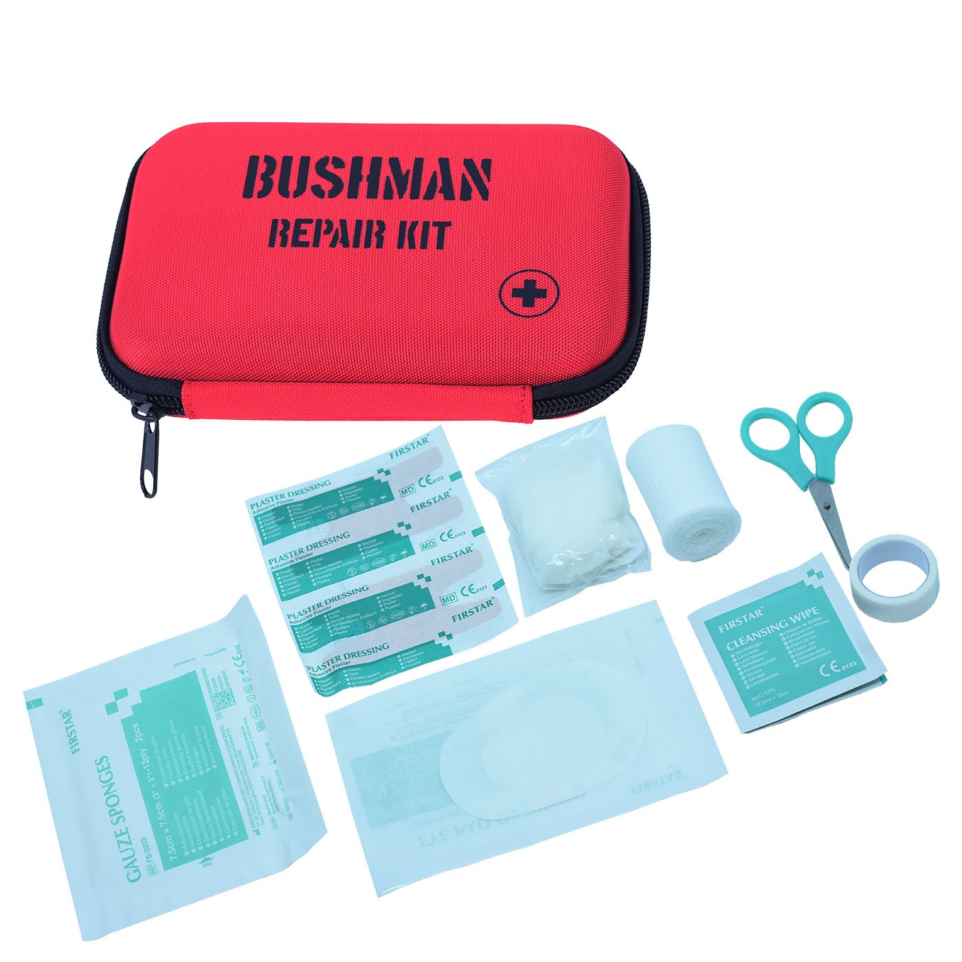 Trusa de prim ajutor REPAIR, într-o husă din poliester, cu imprimeu BUSHMAN, conține un set de plasturi de diferite dimensiuni, bureți de tifon, bandă medicală, bandaj elastic, bandaj pentru ochi, șervețele de curățare, mănuși și foarfece. Dimensiunile carcasei 18 × 11 × 4,5 cm.